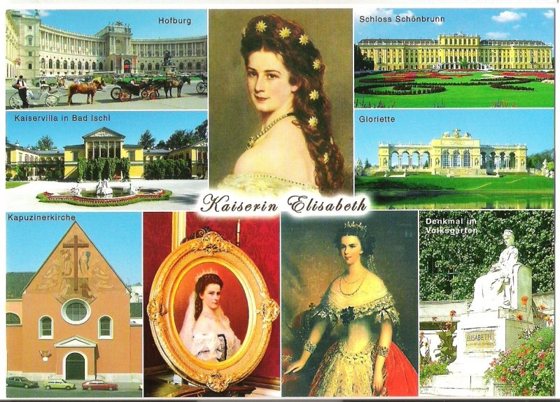 Barevná pohlednice, císařovna Sissi a její oblíbená místa