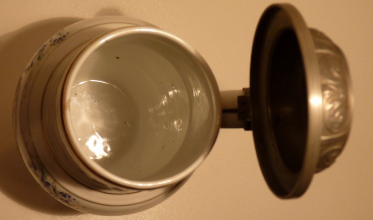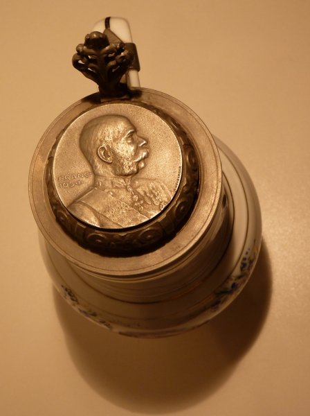 Bílý korbel se zlatými pruhy a s portrétem Franz Josefa na uzávěru