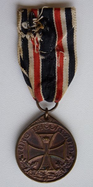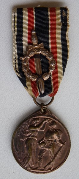 Bronzová medaile , nad medailí na látce je dekorační ozdoba věnec s mečem