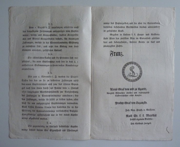 Cirkulář Františka Josefa I.- na vydání mincí 1/4, 1/2 a 1 Kreutzer