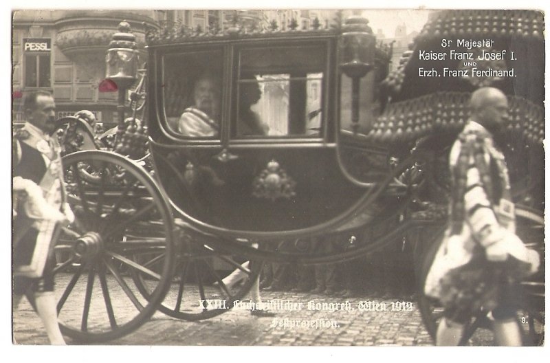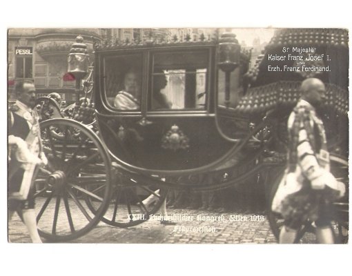 Císař Franz Josef a Franz Ferdinand projíždí městem