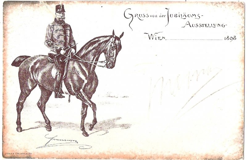 Císař Franz Joseph na koni na výstavní pohlednici z Vídně
