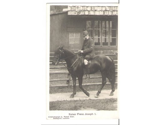 Císař Franz Joseph v mysliveckém oblečení na koni