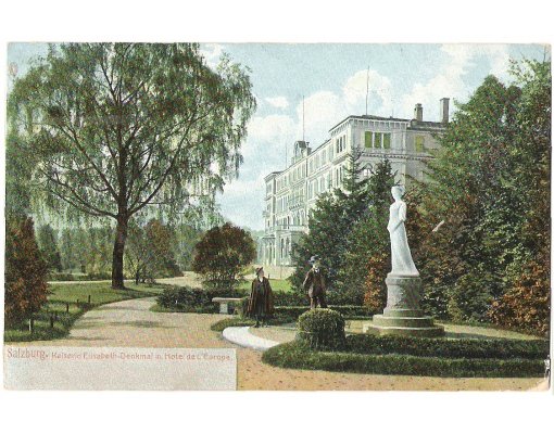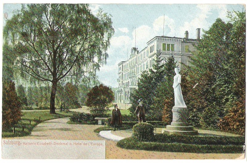 Císařský hotel v Salzburgu, na zahrádce u hotelu stojí socha Elisabeth