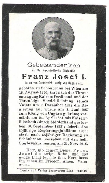 Další podobná varianta úmrtního lístku císaře Františka Josefa