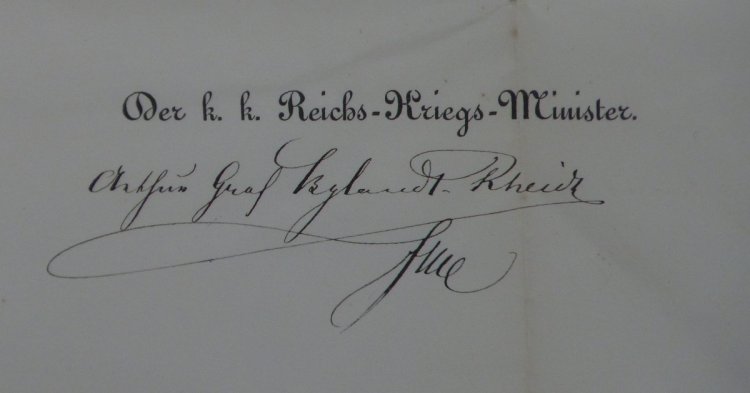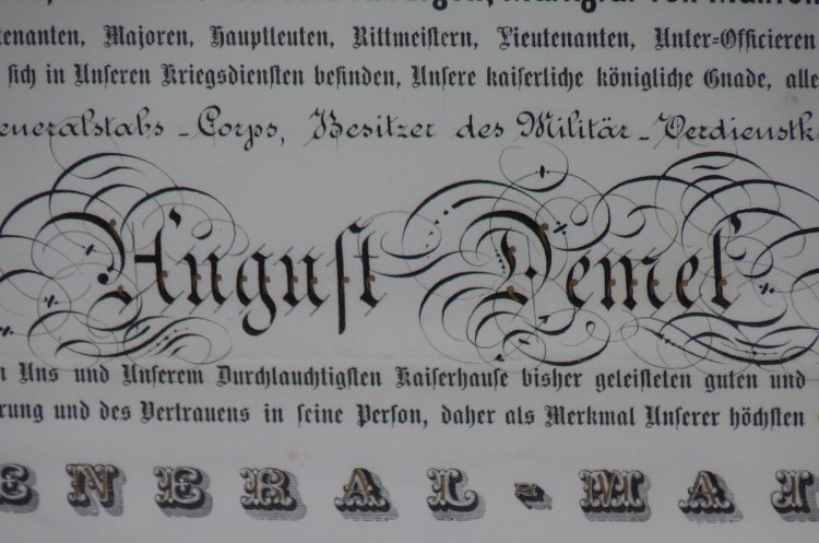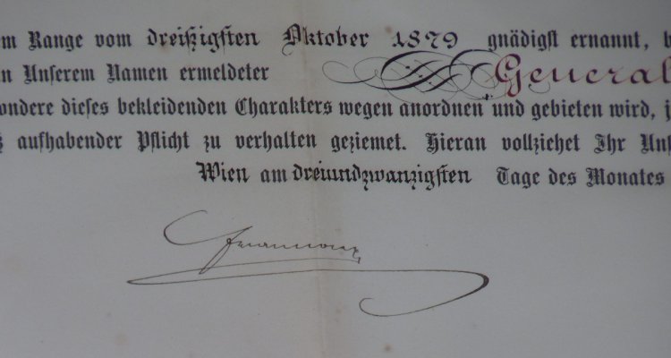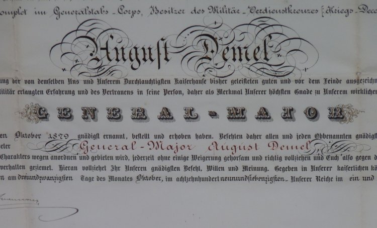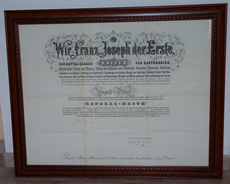 Dekret na udělení hodnosti ,, GENERÁL - MAJOR ,, Františkem Josefem s vlastnoručním podpisem Františka Josefa - pan AUGUST DEMEL - mimořádné .. RRR