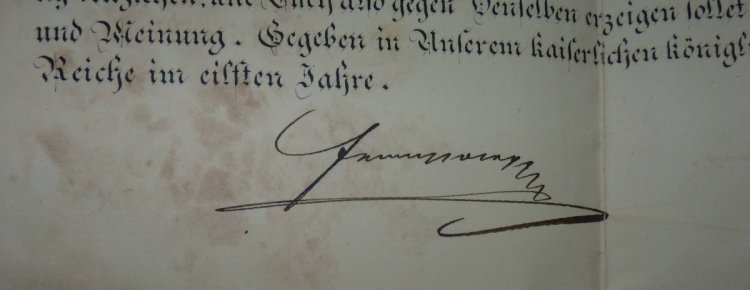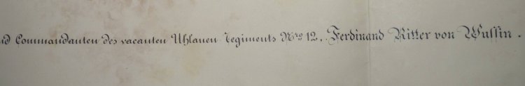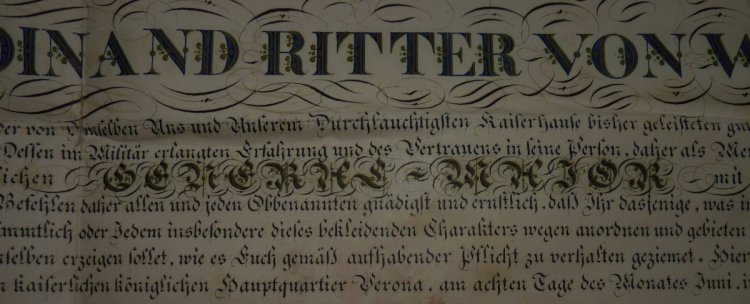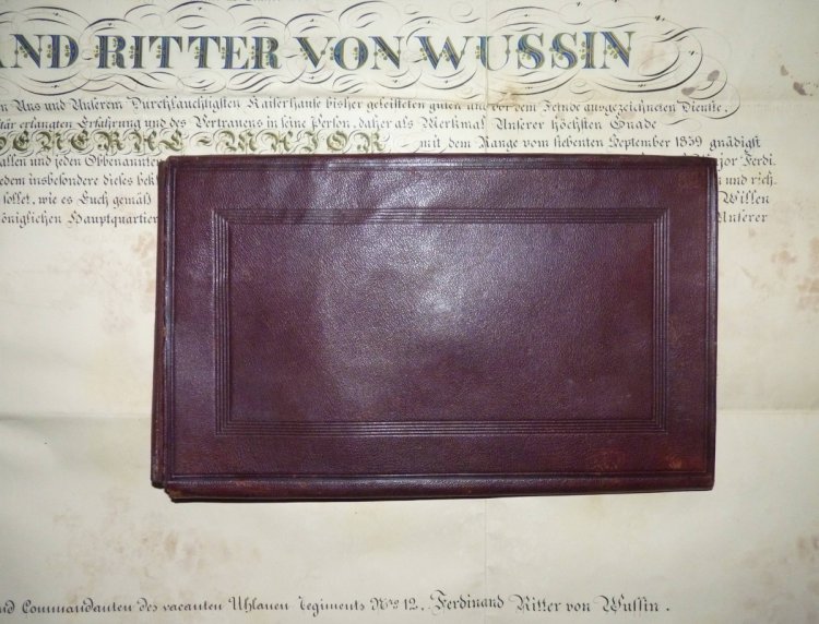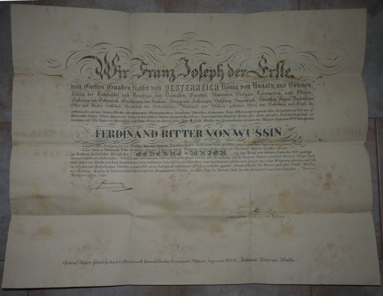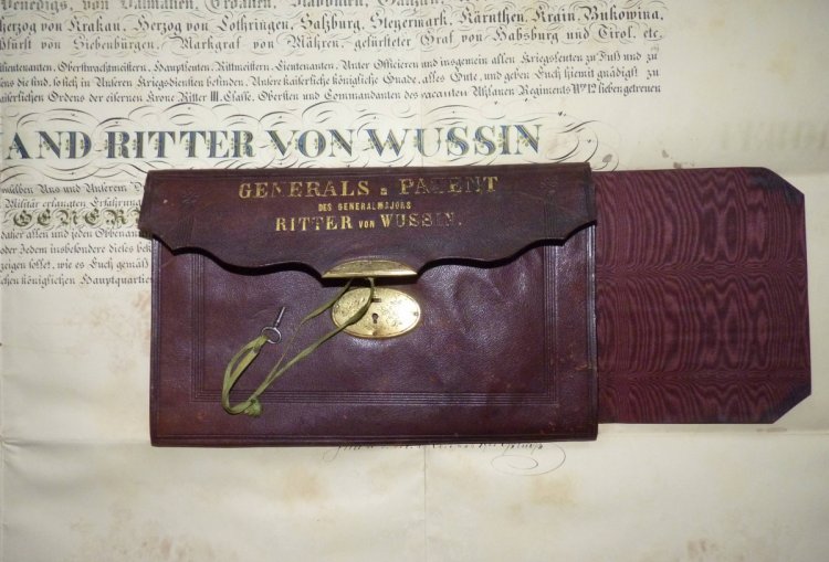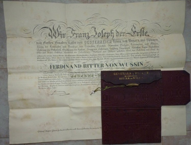 Dekret na udělení hodnosti GENERÁL - MAJOR ... Františkem Josefem s vlastnoručním podpisem Františka Josefa - ,,FERDINAND RITTER VON WUSSIN - včetně speciálně vyrobeného koženého pouzdra... mimořádné .. RRR