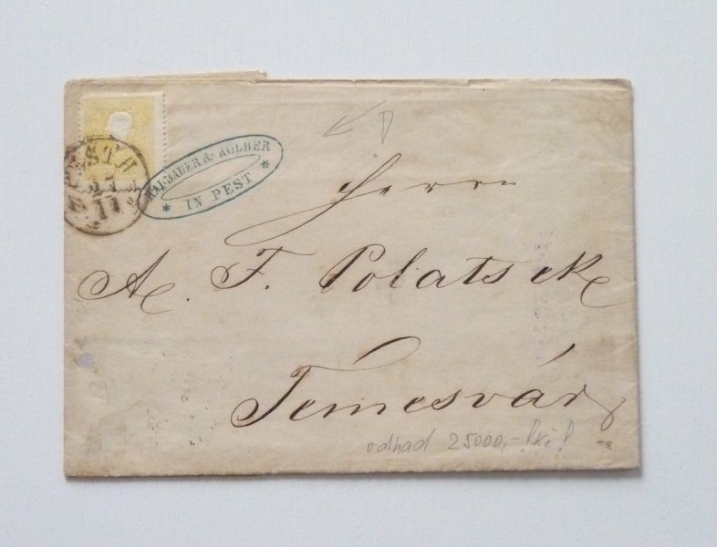 dopis frankovaný 2 Kr , razítko Pest , podnikové razítko - mimořádné