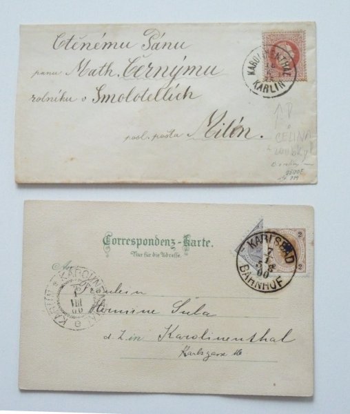 Dopis frankovaný výstřižkem z celiny 5 Kr a vysokými zoubky, pohlednice s půlenou 1 Kr plus 2 Kr