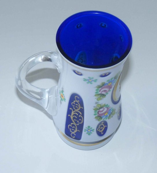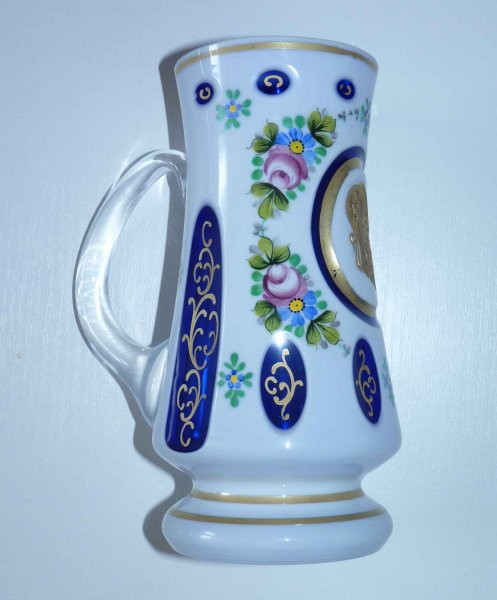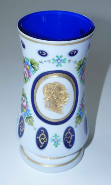 The extraordinary exhibit - a pint with a keen portrait of Emperor Franz Josef, two laminated glass, preserved - showcase quality