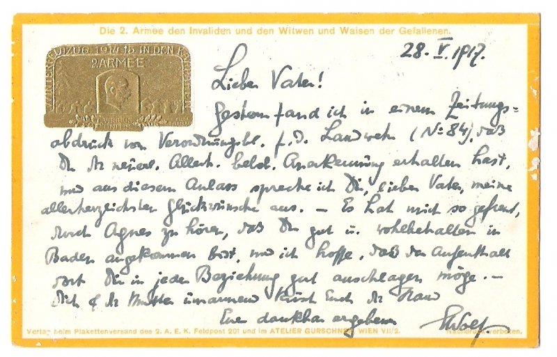 Field postcard , Franz Joseph in a frame , interesting sub-centrical print