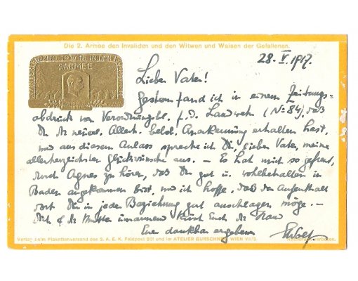 Field postcard with green additional advertising stamp of Franz Joseph I. © 2012 franz-josef.cz; realized KETNET Ltd. (website, e-shop, web presentations), hosted and operated by CMS Modeline MODElina, connected to the network TaNET