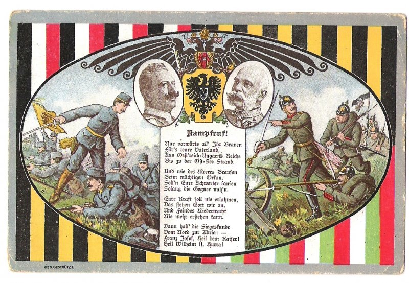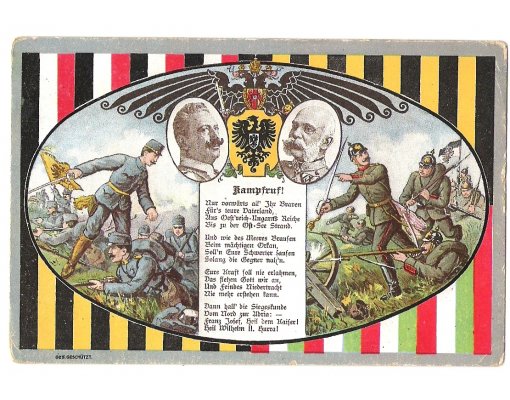 Austrian soldiers during defending in trenches , portrait of Franz Joseph