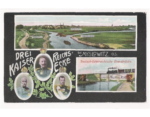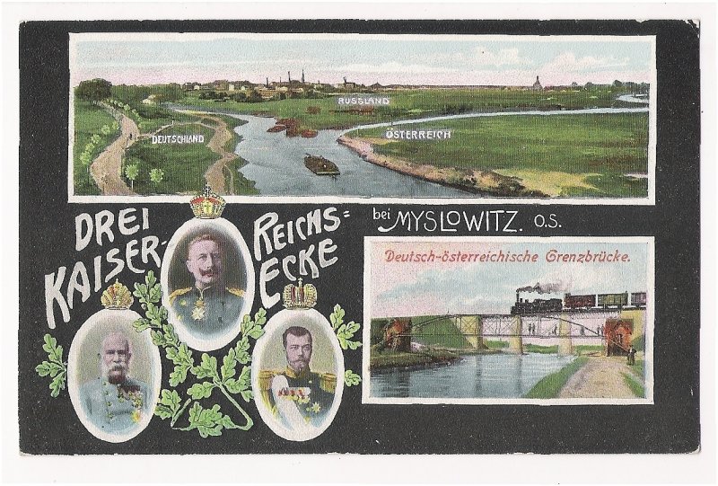 German - Austrian border bridge and triple portraits of emperors of Austria , Russia and German