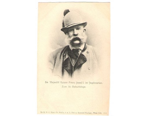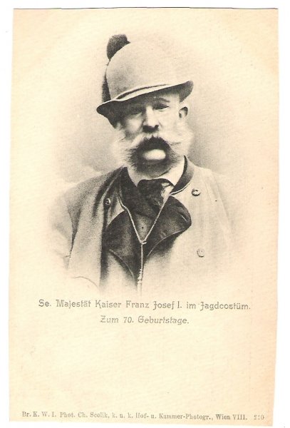 Black and white portrait of emperor in hunting suit , 70th birthday