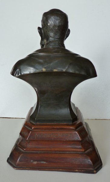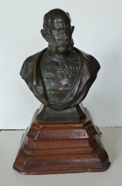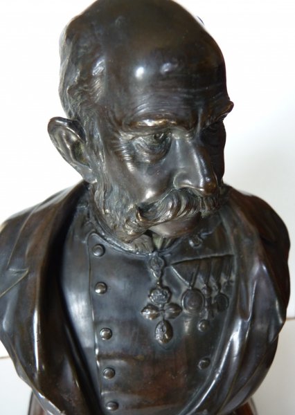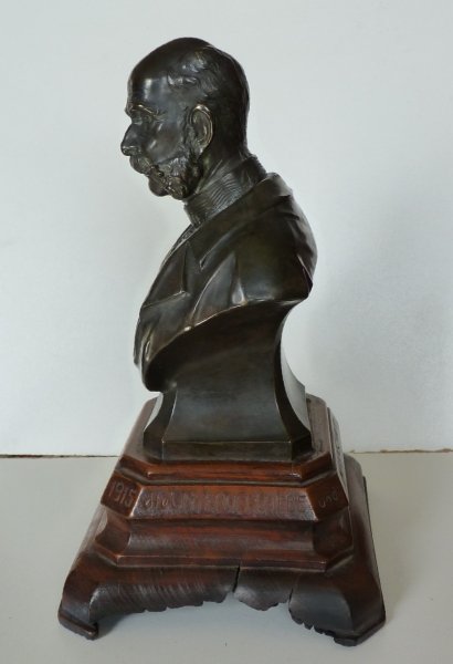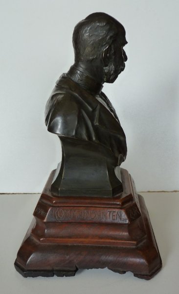 Black bust of Franz Joseph on wooden pedestal