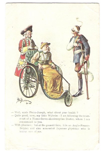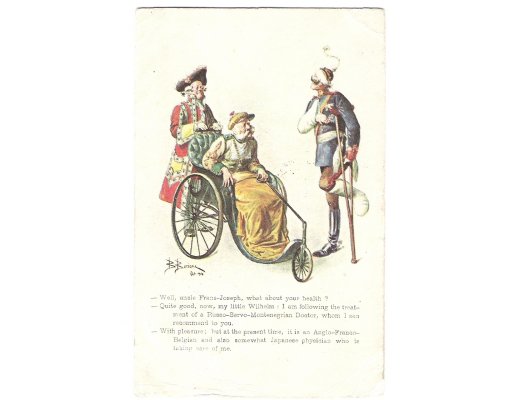 Caricatures of emperors : Franz Joseph on a wheel chair and Wilhelm on crutches