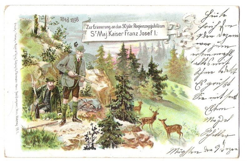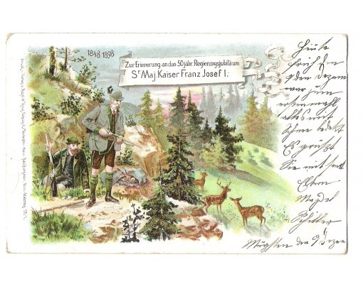 Drawn postcard , Franz Joseph and trophy deer (1) © 2012 franz-josef.cz; realized KETNET Ltd. (website, e-shop, web presentations), hosted and operated by CMS Modeline MODElina, connected to the network TaNET