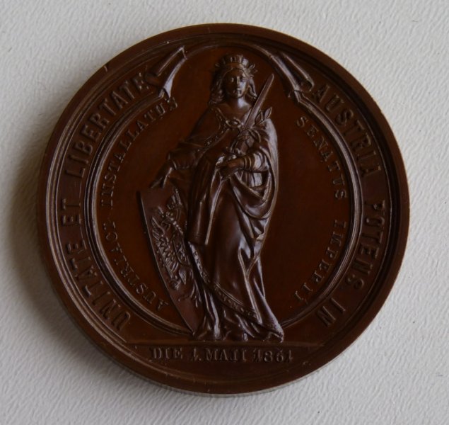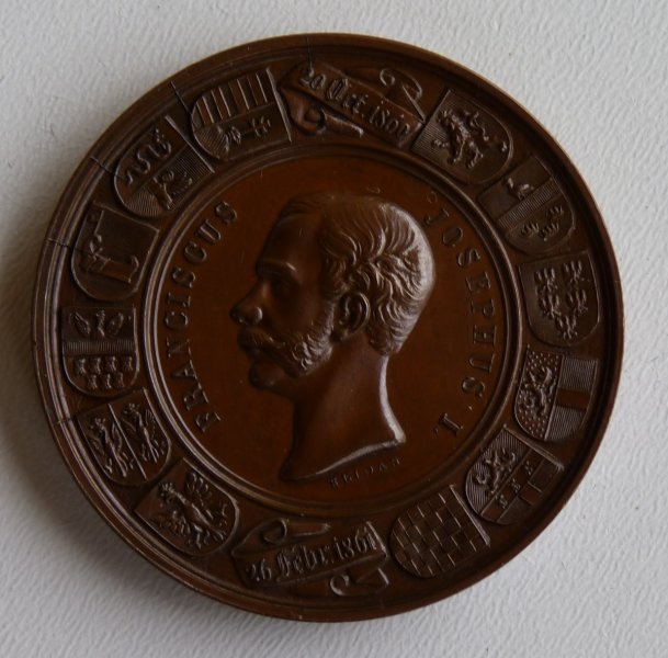 Emperor Franz Joseph with coats of arms on a bronze medal