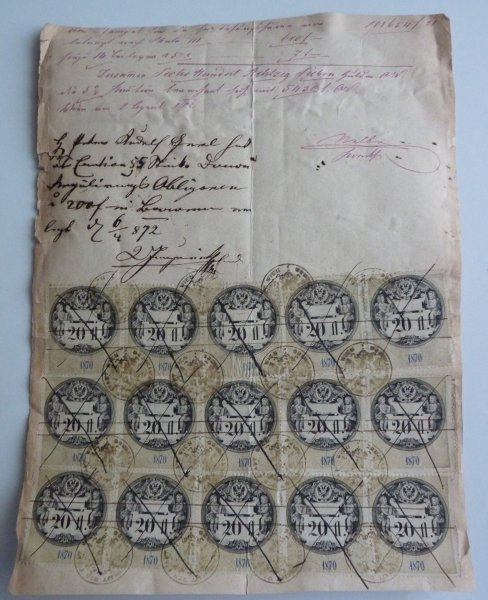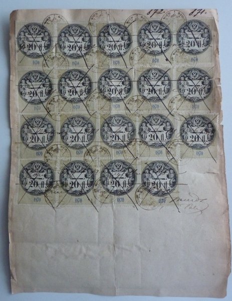 Deed with both sides evaluated by fee stamps - one the first side are 19 times 20 phlorin fee stamps, on the other side are 15 times 20 phlorin fee stamps