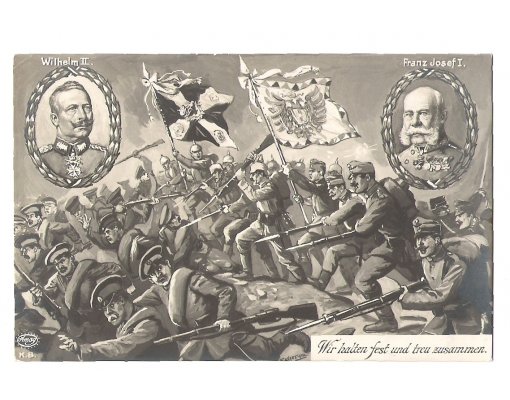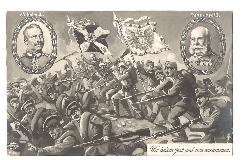 Austrian and German soldiers are chasing the enemy - flags , Franz Joseph and Wilhelm
