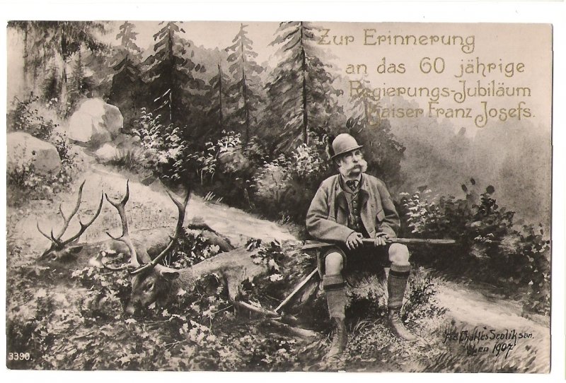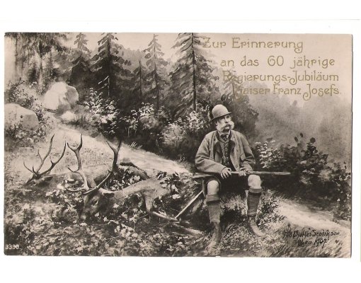 Several portraits of Franz Joseph in hunting suit and his hunting trophy