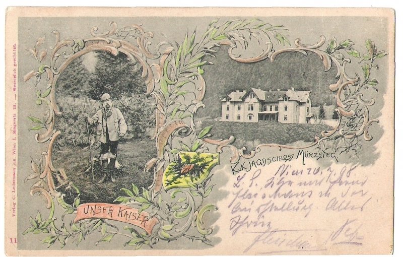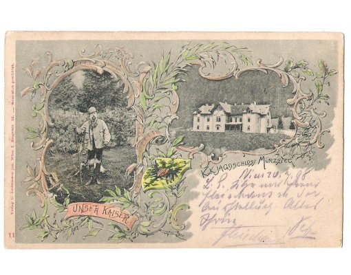 Franz Joseph and view to imperial castle Mürzsteg , colored variant