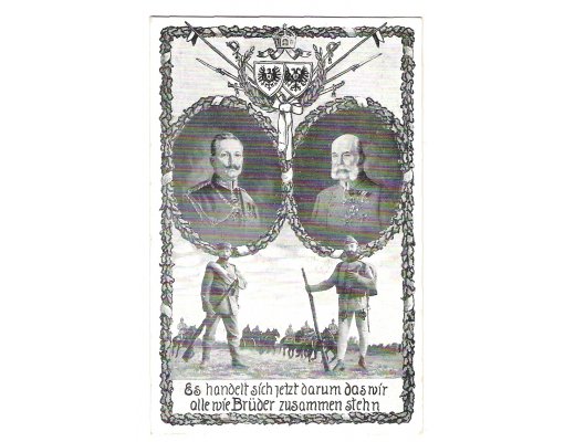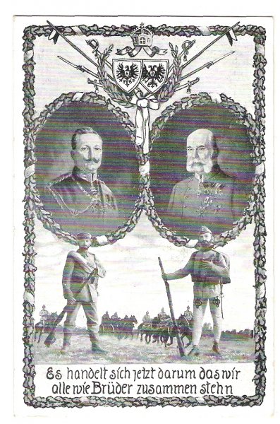 Franz Joseph and Wilhelm with symbols of lands and soldiers