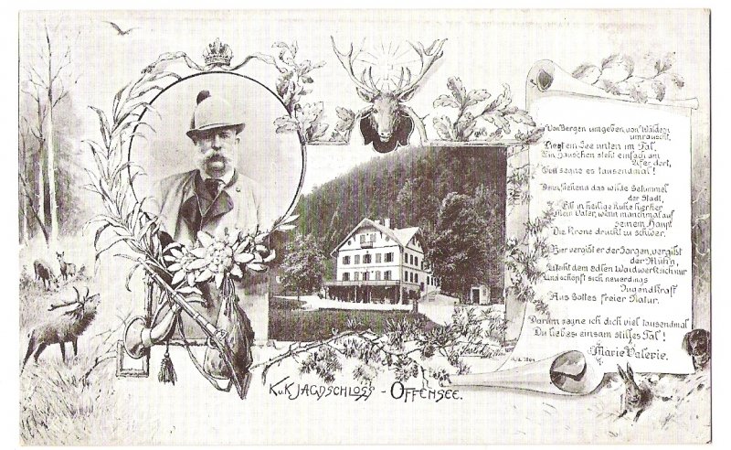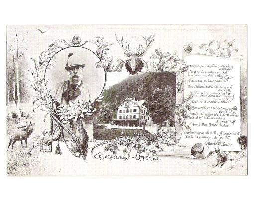 Franz Joseph in hunting suit and view to castle Offensee