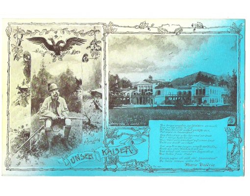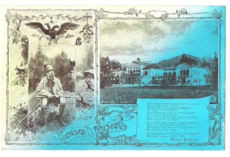 Franz Joseph in hunting uniform and view to imperial villa in Bad Ischl