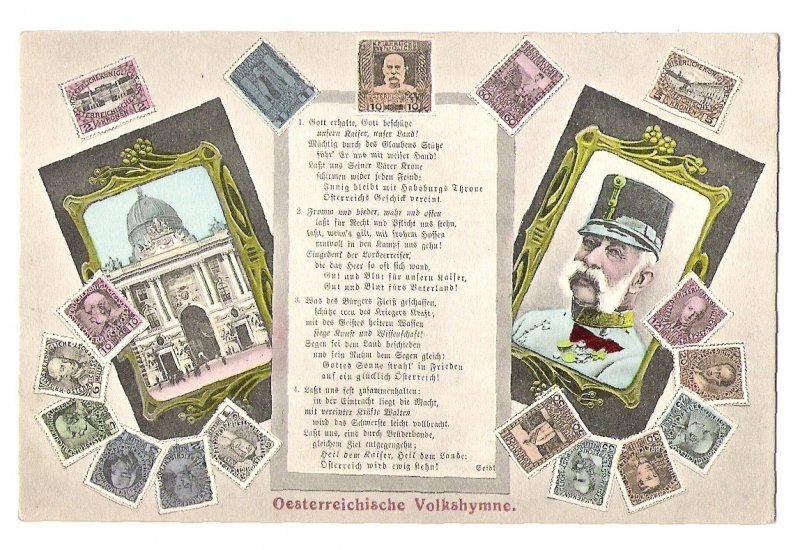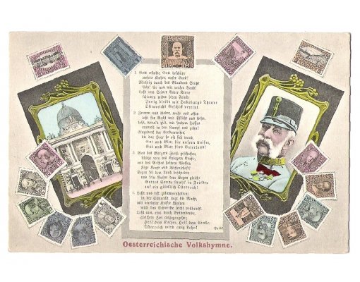 Franz Joseph on stamps , anthem of Austria , Vienna , black print
