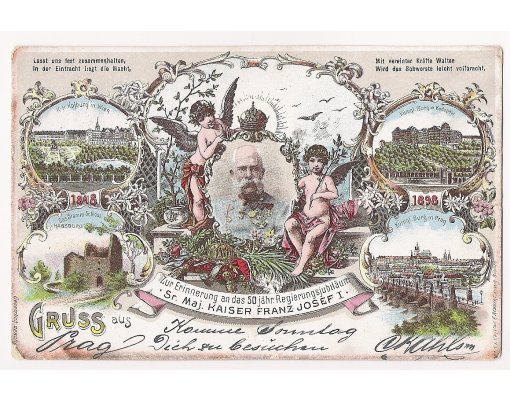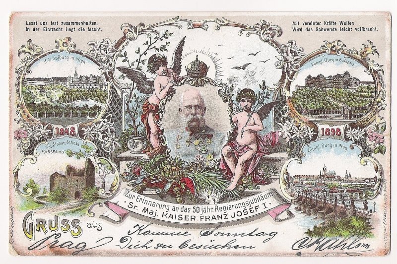 Postcard with portrait of Franz Joseph , monuments of Hofburg , Budapest and Prague