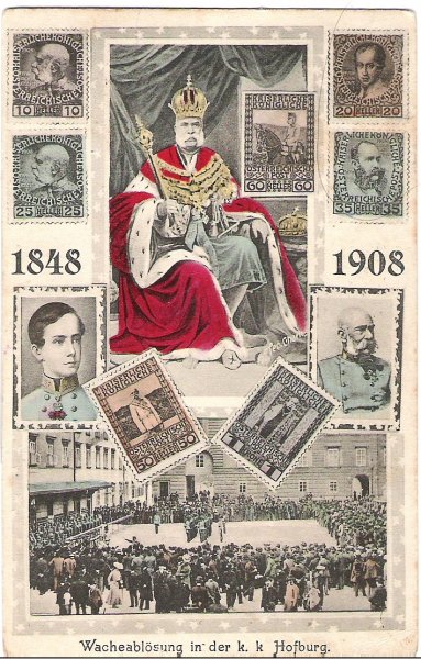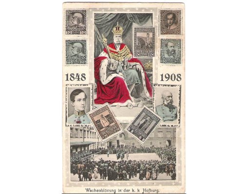 Hofburg , congregation of people and soldiers , emperor and stamps