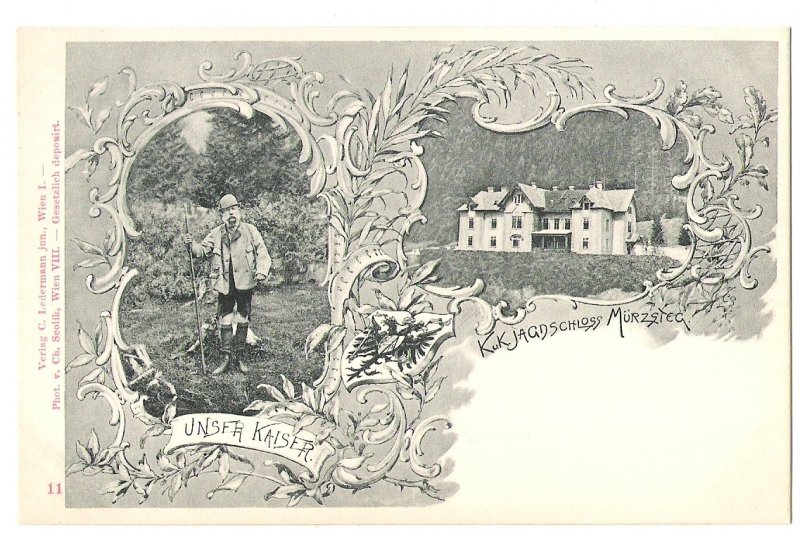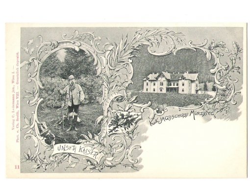 Franz Joseph and view to imperial castle Mürzsteg , colored variant