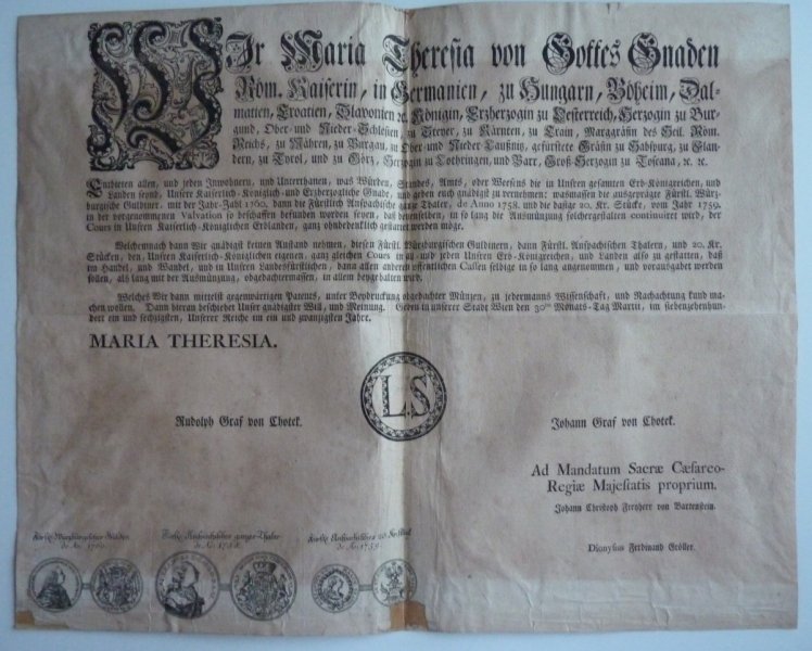 Maria Theresas circular to issue coins, years 1758, 1759, 1760
