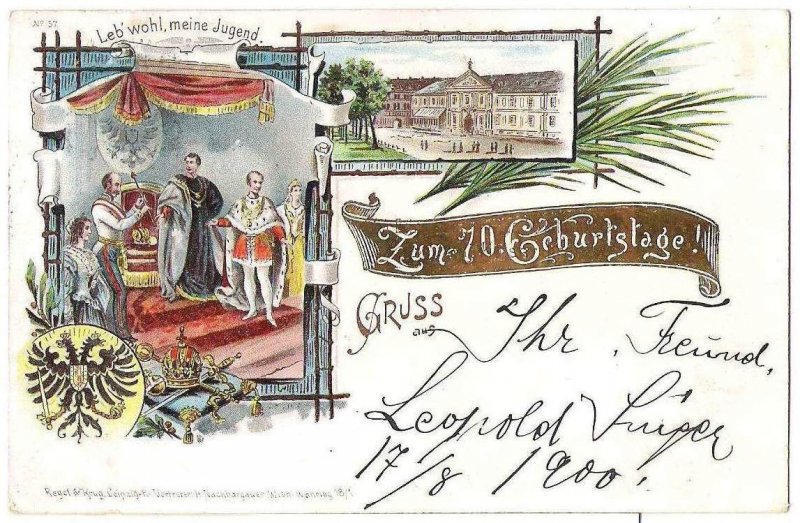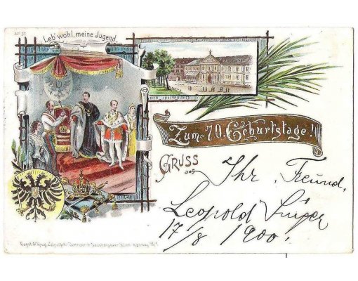 Memory of Olomouc and 50th anniversary of coronation - litography with famous picture of Franz Joseph with golden additional print