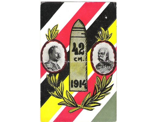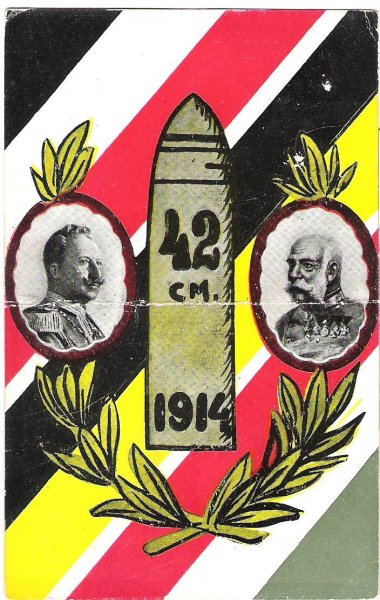 Military theme - patriotism, color postcard - 42 cm cannon-shot and portraits of emperors