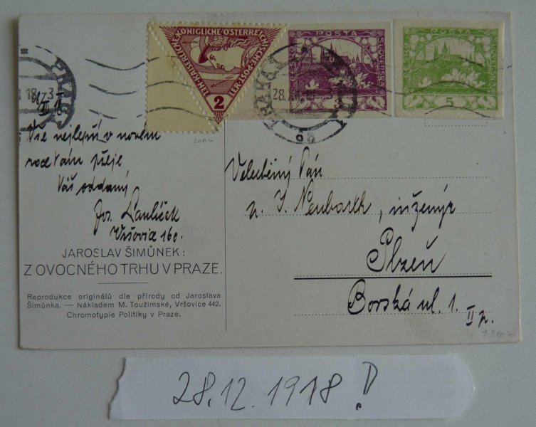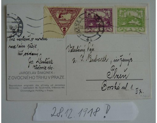 Postcards with mixed franking of Austrian and delivery charges Hradcany stamps - stamp of December 28, 1918 - extraordinary integrity