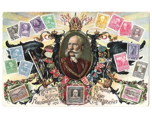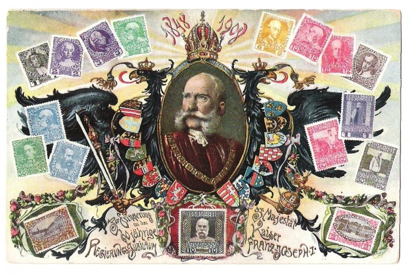 Oval portrait of F. J. , austrian eagle , cold of arms and stamps (1)