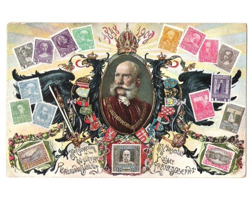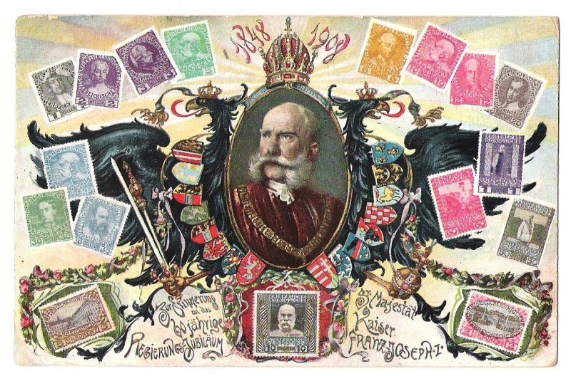 Oval portrait of F. J. , austrian eagle , cold of arms and stamps (1)