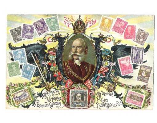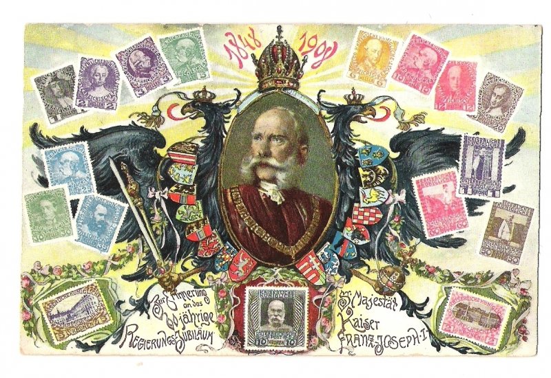 Oval portrait of Franz Joseph , austrian eagle , cold of arms and stamps...