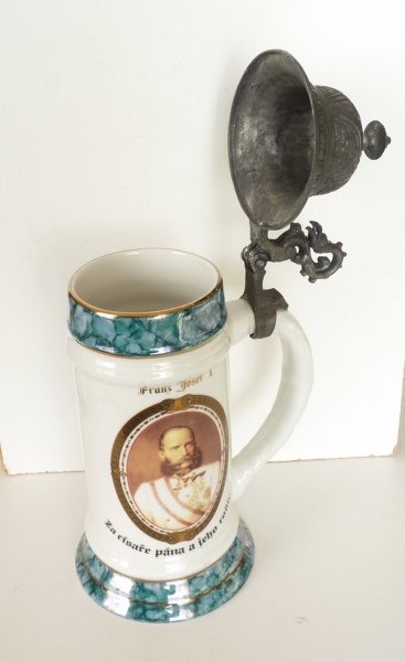 The modern replica of an old pewter lid with a pint and a portrait of the young Franz Joseph I.