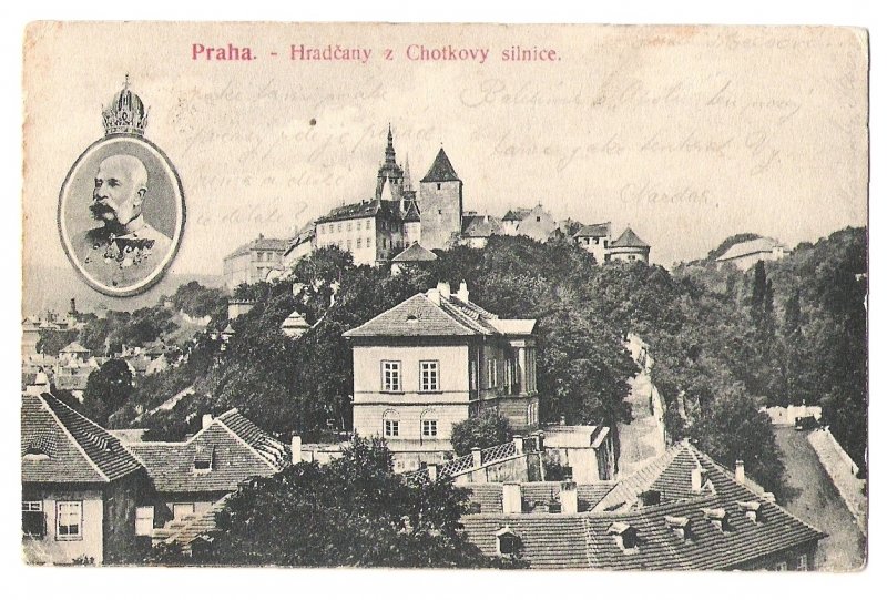 Portrait of emperor Franz Joseph and wiev at Hradčany , Prague