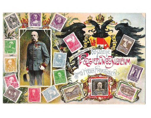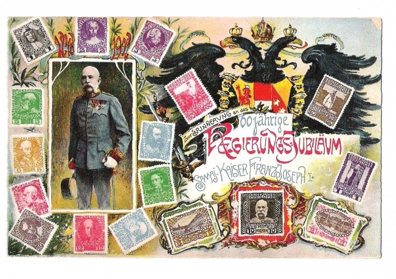 Portrait of Franz Joseph , eagle and stamps