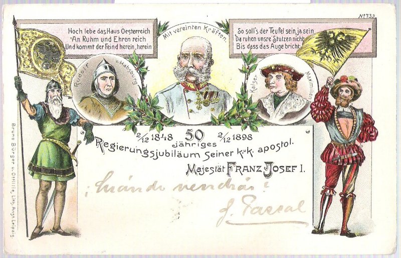 Color postcard - portraits of Franz Joseph and Wilhelm - their predecessors with national flags