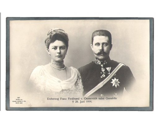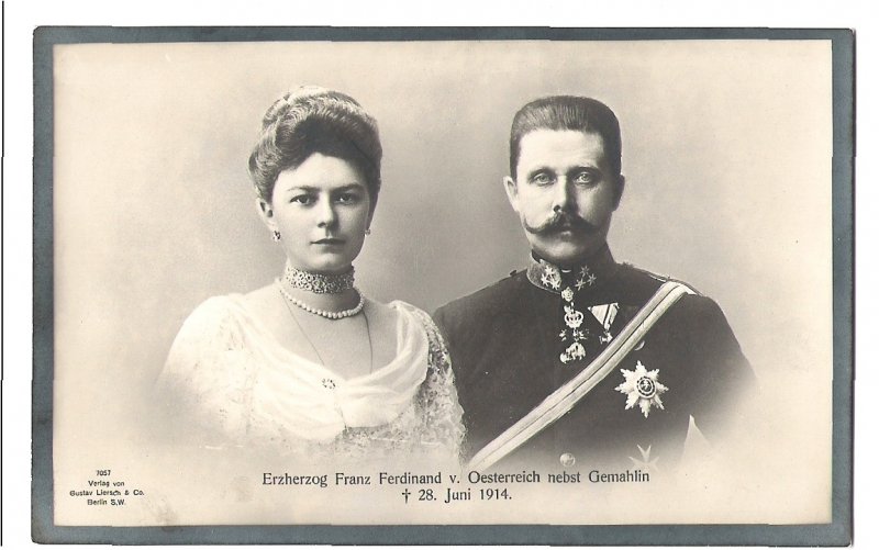 Reverent postcard of Franz Ferdinand with wife and date of assassination ( 28th June 1914 )