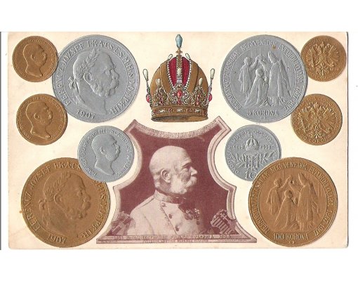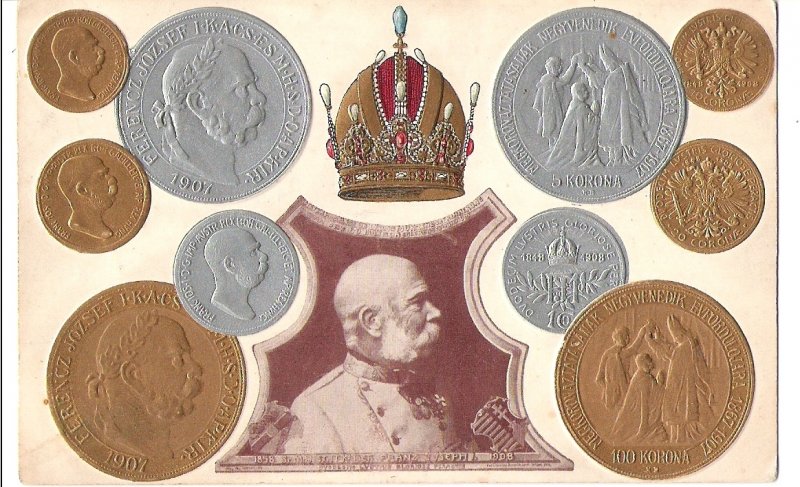Postcard with coins of Franz Joseph - portrait and imperial hymn - hungarian edition