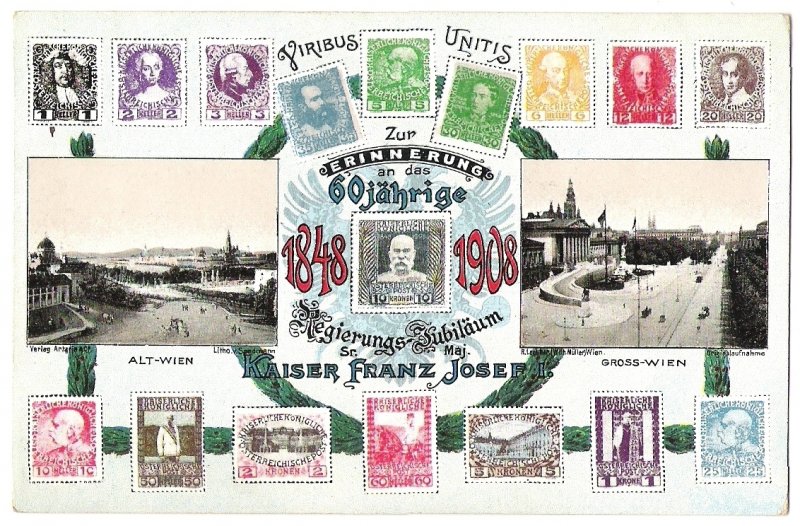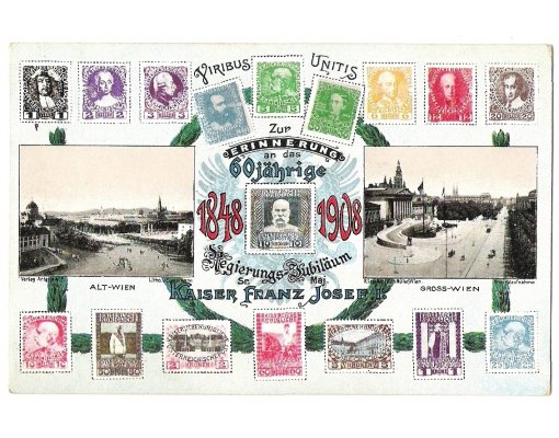 Postcard with printed stamps of anniversary of 60 years of Franz Joseph's government