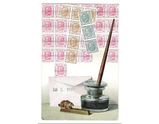 Printed stamps , ink-bottle with a pen and sealing-wax