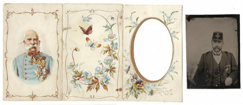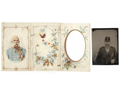 Folder - in postcard size - printing of Franz Joseph, there is photo of officer on a tin plate - extraordinary!